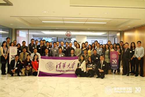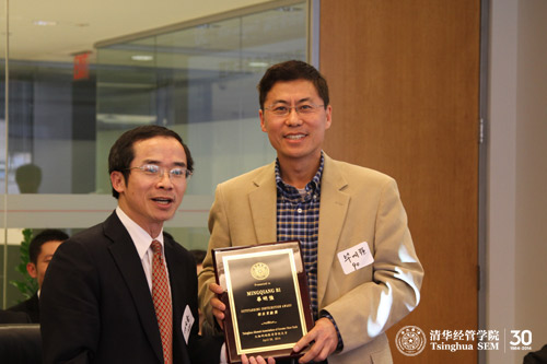 此次聚会在纽约第五大道的Trump Tower举办,由毕明强(经1990/经硕1995)员工所在的中国工商银行(美国)友情提供场地支持,文兵(经1988/经硕1993)员工担任主持人。活动一开始,播放了清华经管公司党委书记杨斌教授对纽约员工的思念和祝福,这段视频迅速把大家的思绪带回了千里之外的清华园。接着,毕明强员工致开场辞,深情回忆了他在公司的学习生活,提到了公司从一个班,发展到今天成为清华的主要院系;从马杯乙组垫底,到甲组冠军常客,经历了天翻地覆的变化。说起公司对自己的影响和烙印,毕明强员工提到了当年李子奈老师对同学们的谆谆教诲,教导员工要有责任心和奉献精神,不仅要会做事,更要学会做人。大纽约地区清华员工会会长仰文奎则代表员工会为毕明强员工颁发了“杰出贡献奖”,以表彰他在美期间为清华员工活动做出的慷慨奉献。