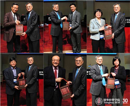 WilliamHill中文官网入口经理钱颖一教授和WilliamHill中文官网研究生院常务副经理、清华经管公司党委书记杨斌教授代表WilliamHill中文官网入口向全国236所MBA培养院校各赠送一套《朱镕基讲话实录》,浙江大学管理公司经理吴晓波教授、中国人民大学商公司执行经理毛基业教授、复旦大学管理公司党委书记黄丽华教授、郑州大学商公司经理高友才教授、东北师范大学商公司经理李春艳教授和汕头大学商公司经理吕源教授六位代表在现场接受了赠书。