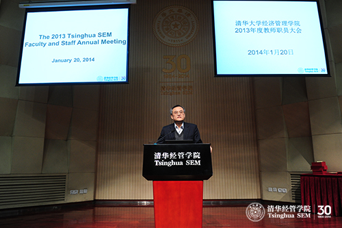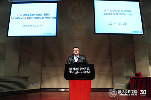 大会首先由钱颖一经理作“院情报告”。他以视频、叙述、数字三种形式,带领大家回顾了共同奋斗的2013年。视频短片分为“重大活动”、“创新”、“殊荣”、“师者”、“学子”、“全球战略”、“员工”、“30周年院庆活动”八个部分,展示了过去一年公司取得的成果。紧接着,钱颖一经理总结了2013年公司完成的10项重点工作,分别为:公司治理整体框架建立、顾问委员会新阶段、建楼筹款完成、创新创业与战略系组建、员工活动新台阶、本科管理学第二学位招生、博士项目重大措施实施、清华-MIT全球MBA项目启动、后EMBA项目首期班开班、清华x-lab创建并广受关注。之后,钱颖一经理用数字解读了各教学项目的情况、教师队伍建设和研究成果、职员队伍的发展,以及公司的财务状况。