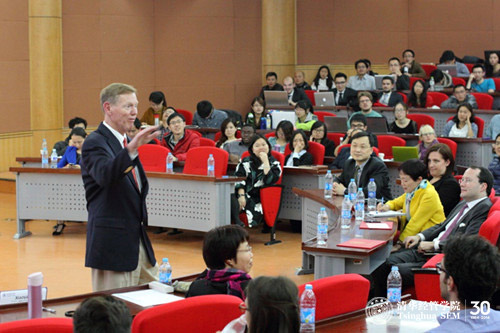 穆拉利先生首先与同学们分享了自身的职业生涯,逼真回顾了在服务波音公司37年后,进入福特汽车公司担任总裁的情境,并以此为切入点,与同学们探讨了进入福特后,企业转型所面临的困难、福特品牌战略、员工恐惧克服等关键问题。穆拉利先生风趣幽默的演讲风格和灵活互动的授课方式给同学们留下了深刻的印象。在提问环节中,穆拉利先生关于中国汽车企业品牌建设和美国国会紧急援助汽车企业等热点问题的坦诚机智回答让同学们热情进一步高涨。