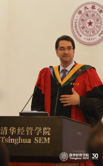 接着,2011届TIEMBA员工Gregory Fossey上台发言。他回忆道,三年前,他也是在这间多功能厅参加自己的毕业典礼。毕业时,他心情复杂,尽管再没有繁重的课业压力,却觉得茫然若失,面对与老师和朋友的离别,他深深感到不舍。现在,他为自己当初的选择感到骄傲,在TIEMBA他不仅学到了知识,更增强了应对挑战的能力。Gregory Fossey代表员工衷心感谢清华与INSEAD通力合作创办了这一项目,并且致力于提高其国际影响力,为员工的发展带来了很多益处。最后,他向2014届毕业生表示祝贺。