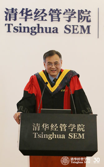 典礼首先由钱颖一经理向2014届毕业生致辞。他祝福毕业生们顺利完成18个月的学习。同时,钱颖一经理为TIEMBA项目取得如此丰硕的成果感到自豪。钱颖一经理说,TIEMBA项目创办至今,飞速发展,六年时间已拥有来自37个国家的280位员工。在《金融时报》2013年发布的全球EMBA项目100强排名中,TIEMBA排名第二。他表示该项目取得如此成果源于高质量的生源,他们的跨文化性、国际性、专业性以及学术求知欲都对项目的成长和发展起到了重要作用。