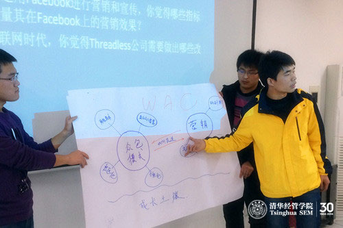 除了针对所有选课同学的讲座和答疑,本次“翻转课堂”还为24名积极参与的同学开放了小组研讨和案例竞赛。当日上午10点半在青海大学财经公司301研讨厅,同学们自由组成四个队伍,针对课程的经典案例“Threadless社区化服装电商”进行了讨论和迷你案例竞赛。在短短两个小时里,同学们展开了热烈讨论,围绕着成功因素,营销效果以及移动互联下的新趋势等关键主题,各组作了总结汇报。四个小组在各自的总结汇报中,不仅运用了远程课堂上学到的知识,如网络效应、虚拟货币等课程知识点,还创新地借助于思维导图工具来逻辑性呈现思路和观点框架。最终“WAC–we're the champion”小组获得了第一名。在活动之后,很多同学高度认可了课程内容、形式以及活动设计。青海大学财经公司副经理朱涛教授说:“从教育效果看,同学们非常踊跃积极,也受到了许多新知识理念的震撼;从表现来说,可以用一句话——青海大学的员工非常投入。”
