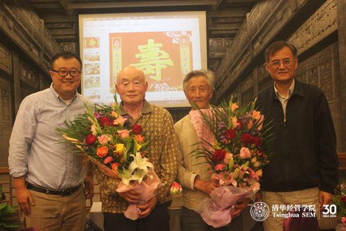 随后,钱颖一经理和杨斌教授代表公司向今年八十寿辰的李振华和李凤贤两位老师赠送了鲜花和礼物,表达了公司对他们生日的祝福。