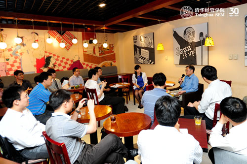 2013年6月8日晚,清华MBA“匹萨之夜”活动在舜德楼咖啡厅举行。本次活动聚集了2010、2011、2012级的数十名MBA同学,大家与钱颖一经理面对面近距离交流,反馈学习、生活中遇到的问题,畅谈人生规划与职业发展。。