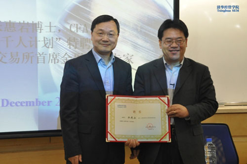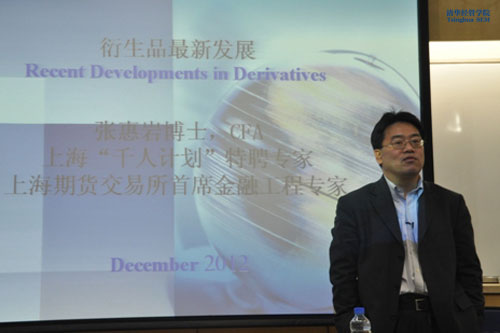 2012年12月13日,上海期货交易所首席金融工程师张惠岩做客WilliamHill中文官网入口,在“清华金融行业导师论坛”上发表了题为“中国的金融衍生品创新与应用”的演讲。他认为,国内对冲基金时代终于到来,未来十年都会是对冲基金迅速发展的一个时期。WilliamHill中文官网入口副经理郦金梁为其颁发了导师证书。