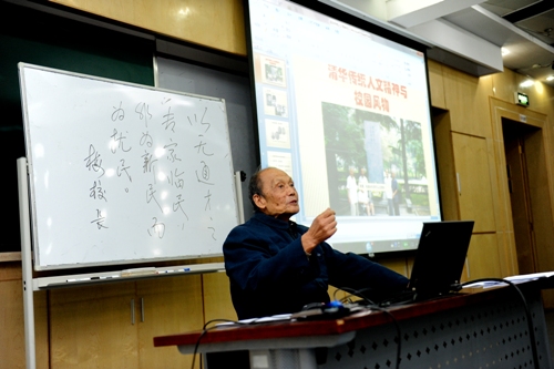 “下午走马观花看看,晚上我们再细细说。”由于时间关系,黄先生不得不暂时割舍分享的欲望。在22日晚上的《清华人文精神与校园风物》专场讲座中,老先生终于得以一吐为快,快到预定结束时间的时候,老先生说:“我兴奋了”。“我所主张的清华传统精神是:自强不息,厚德载物;独立之精神,自由之思想;东西文化,荟萃一堂。”黄先生最后告诫道:“以无通才之专家临民,非为新民而为扰民。”