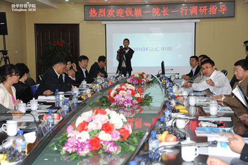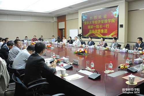 随后,钱经理一行来到内蒙古满世投资集团,满世集团集煤炭产运销、房地产开发、百货商贸、金融服务、生态旅游五大产业协同发展,被评为内蒙古最具发展潜力品牌。在满世集团党委书记、副总裁、清华EMBA08级员工刘至主持下,钱经理与满世集团董事长刘满世、满世集团总裁刘强就宏观经济走向、煤炭企业发展时机等问题进行了交流。