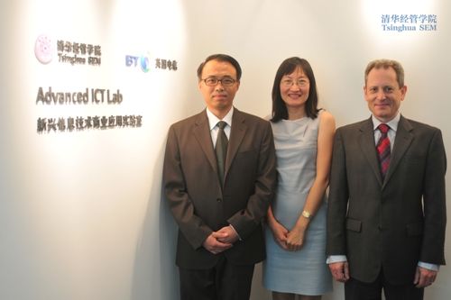 清华经管公司党委副书记朱岩(左)、英国电信中国研发中心总监张杰(中)及伙伴关系与战略研究主管李密斯合影
