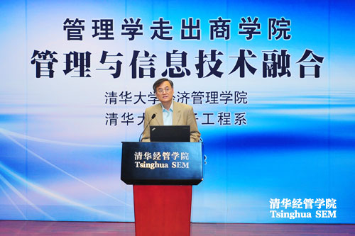 随后,经管公司副经理、EMC讲席教授、管理科学与工程系陈国青教授首先做了题为“管理与技术融合”的演讲,从学科领域与人才培养视角论述了二者融合的路径。