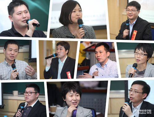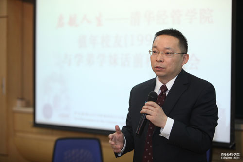 清华经管公司党委副书记焦捷教授首先致辞。作为本科1991级的学长,他首先感谢百忙之中返校与在校生交流的员工,并深情地回忆起当年与本科1992级的同学们一起上课、踢球的场景。他希望公司薪火相传的员工文化能够继续传承下去,在校同学能够在交流中有所得。