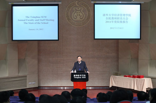 钱颖一经理首先发表“院情报告”。他首先用一个10分钟的视频短片向全体教职员工介绍了过去一年公司所发生的大事要闻,包括“朱镕基经理回公司”、“《清华管理评论》创刊”、“顾问委员会召开”、“朱镕基经理向公司赠书”等,短片内容充实,形式清新,以大量生动的图片及中英文图释向大家展示了一年来公司各方面的丰硕成果。随后,钱经理向大家报告了各教学项目的情况、教师队伍建设和研究成果、职员队伍的发展,以及公司的财务状况。数据显示,公司在各方面较去年同期都取得了长足的发展。他还特别列举了2011年公司的三大成就,包括本科教育改革取得阶段性成果;教师人事管理体制改革基本完成;硕博研究生招生改革和培养方案改革基本到位。这些措施无疑都对公司的长远发展具有重大意义。