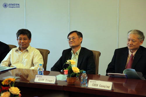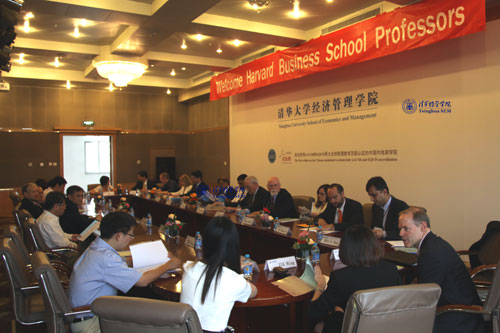 钱颖一经理(中)等公司教授与哈佛商公司教授代表团座谈