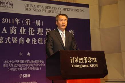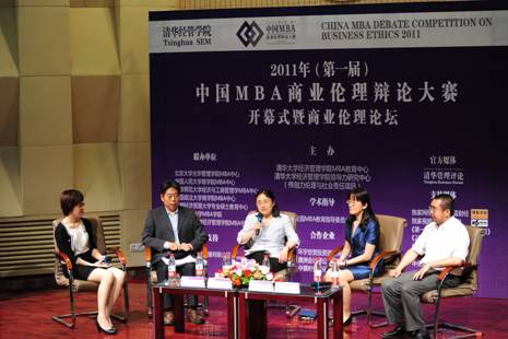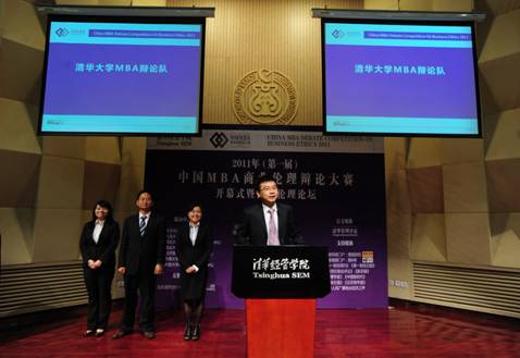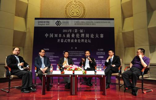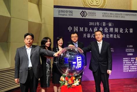 在庄严的音乐中,清华经管公司党委书记杨斌教授、经理助理高建教授、MBA教育中心主任高旭东教授、寰宇世贸投资咨询有限公司执行董事徐丽娜女士、澳洲会计师公会北京代表处首席代表王瑾女士,共同启动了辩论大赛的开幕仪式,宣布2011年(第一届)中国MBA商业伦理辩论大赛正式开始。