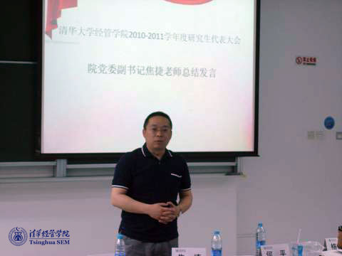 在大会的最后,焦捷教授进行了总结讲话,对研究生会过去一年的工作表示肯定,并祝贺毛日宏同学当选,勉励他带领新一届研究生会开拓创新,更好地为研究生同学服务。