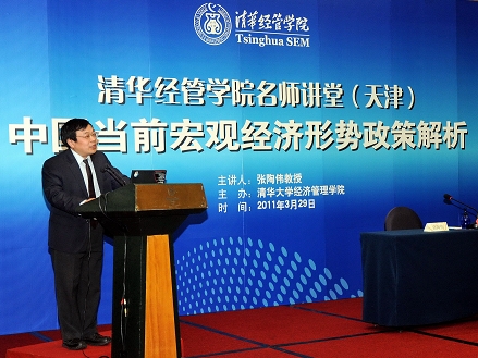 张陶伟教授用幽默风趣的语言为与会者解读了中国当前宏观经济形势及企业的应对之策,并分析了造成当前形势的原因。针对现场近400位企业家和高管人员关心的经济热点问题,张陶伟教授从四个方面进行了讲解,一是分析了当前国际形势对中国经济的影响,指出对中国经济的思考应置于当前国际形势下;二是解读了两会核心主题“控通胀、保增长、调结构、促民生”的意义,并肯定了两会以后的经济形势,鼓励企业通过科学手段,如工业化、信息化实现转型;三是对通货膨胀做了浅显易懂的解释并给出了一些投资启示。除了有形资产投资以外,提倡企业家应注重无形产品人力资本的投入,通过学习提高个人价值和经营视野;四是对未来十五年进行了展望,对我国经济的情况表示乐观,指出天津的发展充满希望,天津的发展会有更多的空间。
