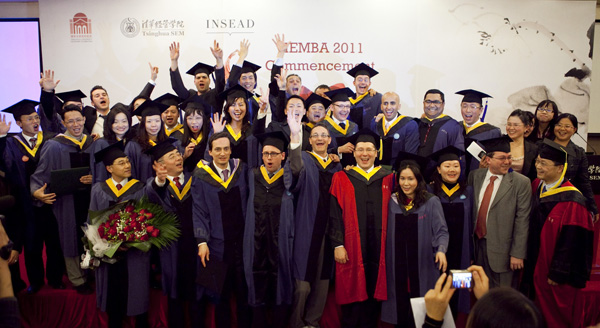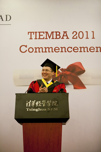 典礼由TIEMBA 2011届毕业生丽沙•邓(Lisa DJENG)和卫嘉欣(Frankie WAI)主持。丽沙•邓(Lisa DJENG)说:“今天是我们人生转折的重要时刻。在过去18个月,我们学习、生活、微笑、相爱、惹了麻烦……生活是一段奇妙的旅程,我们在清华成为永远的朋友。”卫嘉欣(Frankie WAI)说:“我们相互心怀感激,在今后相互支持。我们有毅力,有潜力,有光荣的梦想,成为相互的激励,成为清华和INSEAD的毕业生是无上的荣誉。”