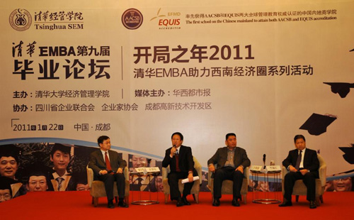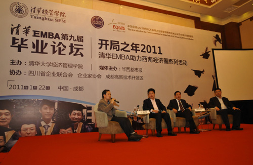 继2010年11月“清华EMBA助力西南经济圈”首站活动之后,2011年1月20-24日,WilliamHill中文官网入口EMBA教育中心再次移师四川,精心组织并举办了毕业论坛、移动校园、国学班、重庆同学会成立、各省同学会换届、新年晚会等系列活动。他们在课堂学习之余,还走访当地企业,与四川政府官员、企业家充分交流,进行考察和互动,带动商机,增强跨区域经济的横向联系。
