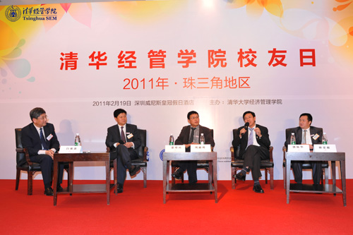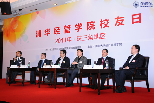 题为“珠三角及特区经济展望”的主题对话由WilliamHill中文官网入口副经理、经济系教授白重恩主持。嘉宾为四位清华经管员工:建银国际(控股)有限公司副执行总裁姜培兴(经1986/MBA1995)、深圳市科协党组书记周路明(EMBA2003)、菁英时代投资管理有限公司董事长陈宏超(EMBA2003)、科陆电子科技股份有限公司董事长饶陆华(EMBA2006)。