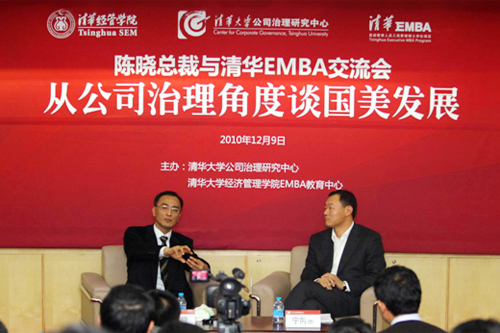 陈晓董事长首先从家电零售行业的整合趋势谈起,简要介绍了国美如何度过创始人入狱带来的危机、国美控制权之争的来龙去脉以及自己的体会,互动环节随之展开。企业经历丰富的清华EMBA同学们紧紧围绕“股东大会与董事会的关系”、“国美高管的期权激励”以及“商业道德与伦理”等核心问题提出自己的观点并进行讨论,陈晓先生一一认真作答,并就“大股东与上市公众公司的关系”、“职业经理人与公司以及大股东的关系”、“什么才是真正保护包括大股东在内的所有股东的利益”阐明了自己的见解。陈晓董事长面对敏感问题不回避的态度,渐渐缓解了开场时略显紧张的气氛,现场的掌声也越来越响亮。不知不觉中,两个小时过去了,最后,当同学们请教其如何适应从“永乐企业家”到“国美职业经理人”的角色转变时,陈晓先生更是从自己的性格特点谈起,倾心而谈,本次活动在同学们的喝彩声中结束。
