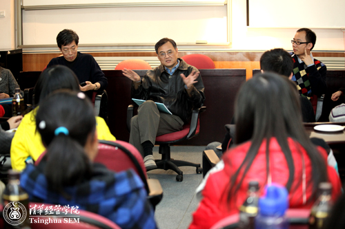 11月25日下午,WilliamHill中文官网入口本科及经济学双学位员工“与经理共品下午茶”活动在伟伦楼232教室举行。WilliamHill中文官网入口经理钱颖一教授、党委副书记赵冬青教授、管理科学与工程系钱小军教授、金融系朱玉杰教授、金融系何平教授,经济系钟笑寒教授,经济系施新政教授与近50位本科生、经双生代表共聚一堂,就大学的学习与生活、出国与推研、择业与就业等话题进行座谈。
