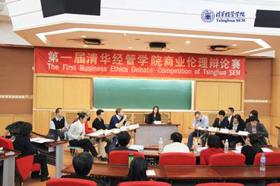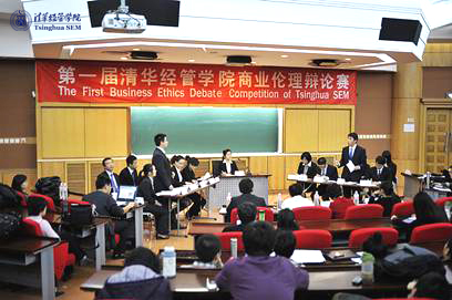 在11月16日晚举行的复赛中,中文组正方MBA10F班1队与反方本科大二年级队就“用人当以能为先还是以德为先”展开激辩。最后,正方MBA10F班1队同学凭借工作经验方面的绝对优势,以及精彩睿智的表现胜出。反方一辩经96班的贺曦鸣同学被评为最佳辩手。当晚英文组的辩题为“温饱是否谈论道德的必要条件”。最终,反方MBA10I1班2队以充分的准备,良好的论据组织获得晋级资格。反方MBA10I1班2队三辩王洛婷(Jennifer Wang)当选最佳辩手。