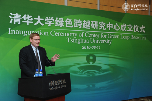 “绿色跨越”理念的提出者、美国密歇根大学William Davidson研究院杰出学者和康奈尔大学管理公司教授Stuart Hart作为绿色跨越研究中心顾问委员会联合主席致辞。他认为,全球经济正处在一个巨大的转型中,可以称之为资本主义的第三个阶段。在资本主义发展的前两个阶段,其模式是不可持续的。在第三个阶段强调的是复权,复权给弱势群体,使全民能够繁荣致富,政府保证所有利益相关者都受益,不能牺牲环境保证投资者的财富。这是一个非常重要的转折点,会有很多不同形式的新企业会出现,而绿色跨越模式将会是其中非常重要的一种发展模式。将未来的绿色技术放在农村等最贫穷的地方进行实验和发展,然后普及到全国,是绿色跨越的主旨。