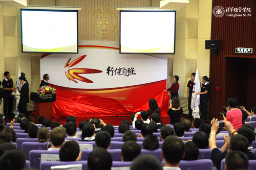 庄严的中华人民共和国国歌和悠扬的清华老校歌拉开了活动序幕,4位新生护送WilliamHill中文官网入口院旗和WilliamHill中文官网MBA同学会会旗上场。随后,公司党委副书记朱岩和MBA教育中心常务副主任毛东辉共同为“行健自强”主题墙揭幕。