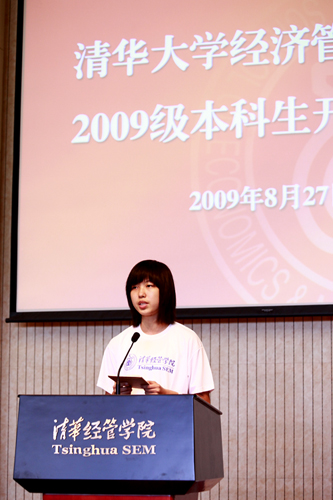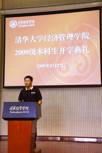经管公司员工会主席张维同学的发言充满理性。他用自己在清华经管三年的感受,告诉学弟学妹们“选择清华经管”,就是“选择了最为广博的知识沃土”、“选择了一片最为开阔的视野”、“选择了作为经管人的荣誉和自豪”。他对新生们说:“未来的道路任重而道远,九字班的师弟师妹们,真心地祝愿你们,能够在清华经管成功地完成人生的蜕变。”