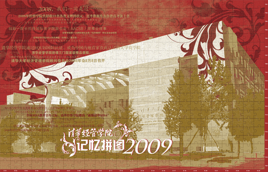 “清华经管记忆拼图”是公司为此次毕业典礼赶制的,采用伟伦楼图样,主色为深沉而喜庆的红色、金色,上面的文字部分为2008年的经管要闻。拼图被分割成500块,每一个小块约4×5厘米大小,背面印有标号(采用坐标形式)和“2009毕业留念”字样。为了经久耐磨,拼图采用亚克力材质,晶莹而有质感。为了确保每一小块拼图的色泽及像素的精致,每一块都单独制图、单独印刷、单独打磨成形。
