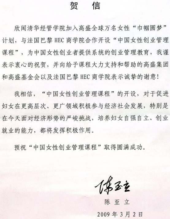 据悉,“中国女性创业管理课程”由高盛“巾帼圆梦”计划资助。高盛在华合资伙伴北京高华首席财务官李群梅女士在启动仪式上表示:“巾帼圆梦”计划是高盛集团推出的企业慈善项目,它是一个由优秀的合作伙伴参与的公益项目,致力于通过提供商业与管理教育帮助接受培训的女性,使之获得更多的商业机会和更快速的成长。高盛的员工也非常愿意以授课或者提供个人辅导的形式对这一计划有所贡献。