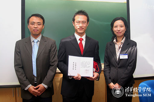 (朱岩老师和刘海红女士共同为获奖员工之一——金钊同学颁奖)