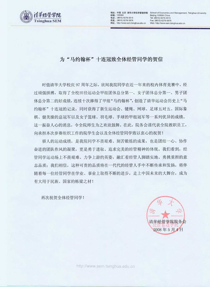 信息会为"马约翰杯"十连冠致全体经管同学的贺信