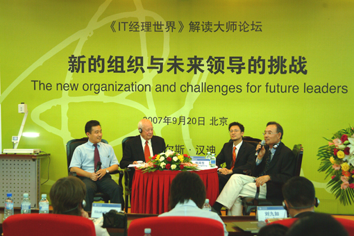 一个多小时的精彩演讲赢得了到场嘉宾的强烈反响和深刻思考。随后,清华经济管公司人力资源与组织行为系陈国权教授作为嘉宾主持,同北京毕越管理咨询公司执行董事田同生先生、价值中国网CEO林永青先生一起,与汉迪教授展开了精彩的圆桌对话。四人机智而幽默的交流,和不时迸发出的智慧与思想的火花,引来场下听众雷鸣般的掌声。