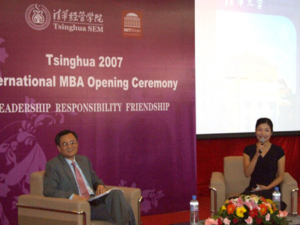 典礼在庄严的清华校歌声中开始。国际MBA项目合作方,美国麻省理工斯隆管理公司经理Alan F. White通过视频向所有的新同学表示祝贺,他告诫新生这只是美好事业开始的第一步,大家应当思考自己来此的目的究竟是什么。06级员工查尔斯作为老生代表,07级员工何鹏与来自韩国的Dannal作为新生代表分别发言。