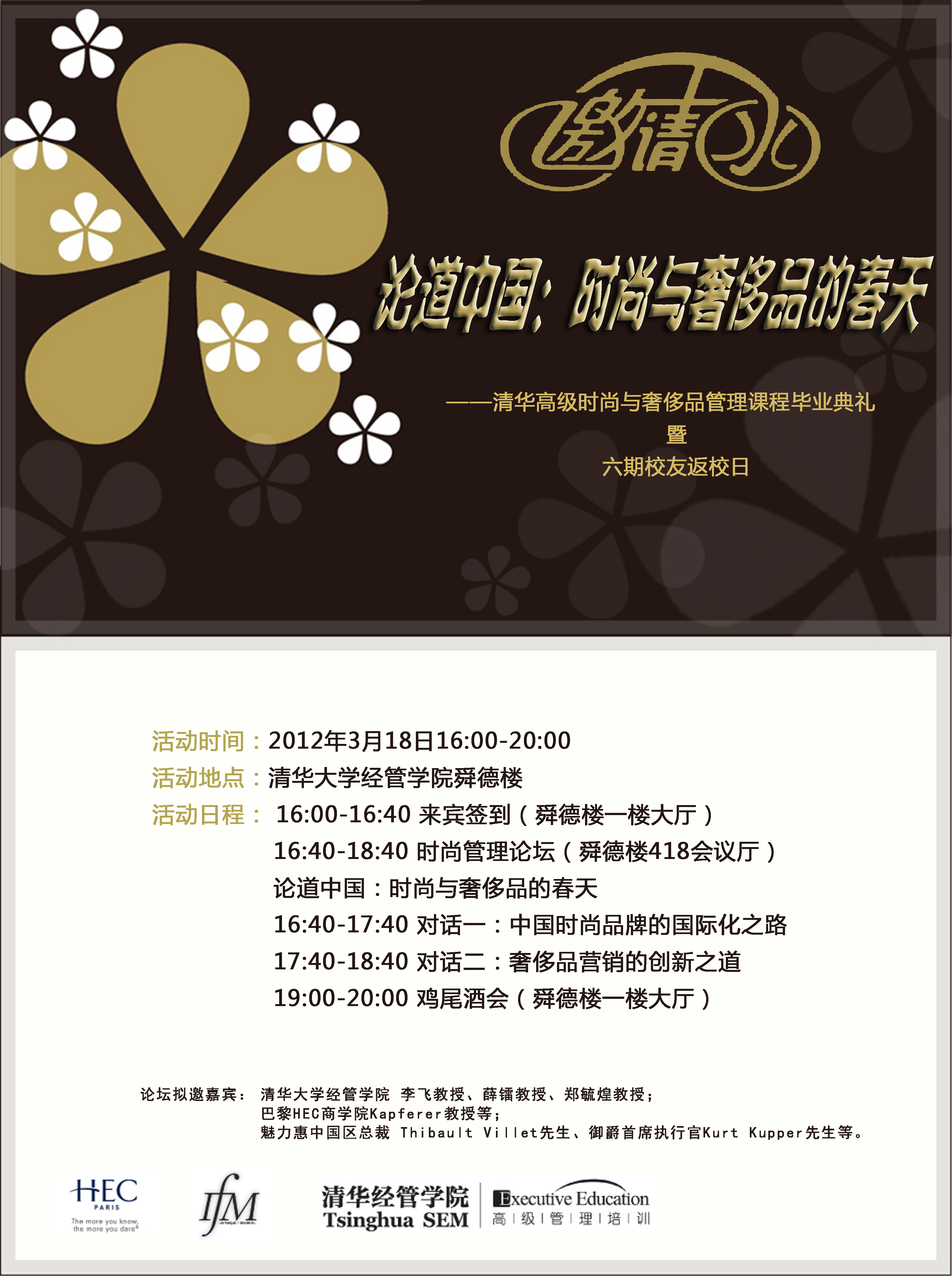 此次活动我们还将邀请WilliamHill中文官网入口、巴黎HEC商公司以及法国时尚公司的教授、国内时尚及奢侈品行业的专业人士出席,与同学们一起,论道中国时尚与奢侈品行业的发展。活动具体安排如下: